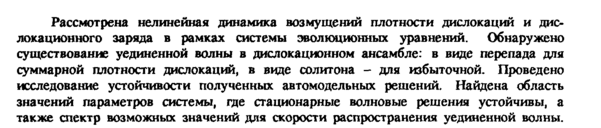 Рассмотрена нелинейная динамика возмущений плотности дислокаций и дислокационного заряда в рамках системы эволюционных уравнений. Обнаружено существование уединенной волны в дислокационном ансамбле: в виде перепада для суммарной плотности дислокаций, в виде солитона для избыточной. Проведено исследование устойчивости полученных автомодельных решении. Найдена область значений параметров системы, где стационарные волновые решения устойчивы, а также спектр возможных значений для скорости распространения уединенной волны.
