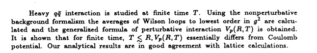 Heavy qq interaction is studied at finite time T. Using the nonperturbative background formalism the averages of Wilson loops to lowest order in g2 are calculated and the generalized formula of perturbative interaction Vp(R,T) is obtained. It is shown that for finite time, Τ < R, Vp(R,T) essentially differs from Coulomb potential. Our analytical results are in good agreement with lattice calculations.