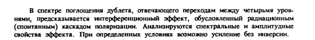 В спектре поглощения дублета, отвечающего переходам между четырьмя уровнями, предсказывается интерференционный эффект, обусловленный радиационным (спонтанным) каскадом поляризации. Анализируются спектральные и амплитудные свойства эффекта. При определенных условиях возможно усиление без инверсии.