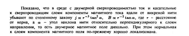 Показано, что в среде с двумерной сверхпроводимостью ток и касательные к сверхпроводящим слоям компоненты магнитного тока вдали от вихревой нити убывают по степенному закону j ос т~ъ tan2 а, В ос г*-2 tana, где г расстояние от керна, а a угол наклона нити относительно перпендикулярного к слоям направления, то есть двумерное магнитное поле дипольно. При этом нормальная к слоям компонента магнитного поля по-прежнему хорошо локализована.