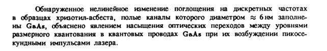 Обнаруженное нелинейное изменение поглощения на дискретных частотах в образцах хризотил-асбеста, полые каналы которого диаметром и бнм заполнены GaAs, объяснено явлением насыщения оптических переходов между уровнями размерного квантования в квантовых проводах GaAs при их возбуждении пик ос е-кундными импульсами лазера.