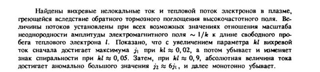 Найдены вихревые нелокальные ток и тепловой поток электронов в плазме, греющейся вследствие обратного тормозного поглощения высокочастотного поля. Величины потоков установлены при всех возможных значениях отношения масштаба неоднородности амплитуды электромагнитного поля ~ l/k к длине свободного пробега теплового электрона I. Показано, что с увеличением параметра И вихревой ток сначала достигает максимума j\ при kl « 0,02, а потом убывает и изменяет знак спиральности при И « 0, 05. Затем, при Ы 0, 9, абсолютная величина тока достигает аномально большого значения ji « 6ji, и далее монотонно убывает.