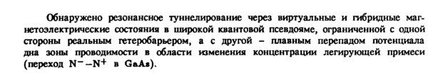 Обнаружено резонансное туннелирование через виртуальные и гибридные маг-нетоэлектрические состояния в широкой квантовой псевдояме, ограниченной с одной стороны реальным гетеробарьером, а с другой плавным перепадом потенциала дна зоны проводимости в области изменения концентрации легирующей примеси (переход N~—N+ в GaAs).