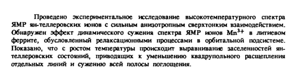 Проведено экспериментальное исследование высокотемпературного спектра ЯМР ян-теллеровских ионов с сильным анизотропным сверхтонким взаимодействием. Обнаружен эффект динамического сужения спектра ЯМР ионов Мп3+ в литиевом феррите, обусловленный релаксационными процессами в орбитальной подсистеме. Показано, что с ростом температуры происходит выравнивание заселенностей ян-теллеровских состояний, приводящих к уменьшению квадрупольного расщепления отдельных линий и сужению всей полосы поглощения.