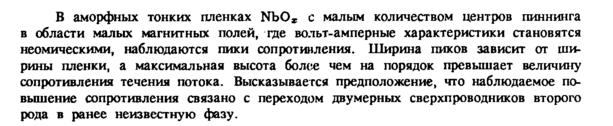 В аморфных тонких пленках NbOz с малым количеством центров пиннинга в области малых магнитных полей, где вольт-амперные характеристики становятся неомическими, наблюдаются пики сопротивления. Ширина пиков зависит от ширины пленки, а максимальная высота более чем на порядок превышает величину сопротивления течения потока. Высказывается предположение, что наблюдаемое повышение сопротивления связано с переходом двумерных сверхпроводников второго рода в ранее неизвестную фазу.