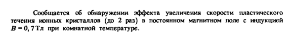 Сообщается об обнаружении эффекта увеличения скорости пластического течения ионных кристаллов (до 2 раз) в постоянном магнитном поле с индукцией В-0,7Тл при комнатной температуре.
