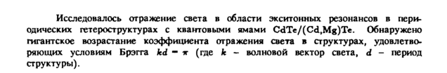 Исследовалось отражение света в области экситонных резонансов в периодических гете рост рукту pax с квантовыми ямами CdTe/(Cd,Mg)Te. Обнаружено гигантское возрастание коэффициента отражения света в структурах, удовлетворяющих условиям Брэгга kd π (где к волновой вектор света, d период структуры).