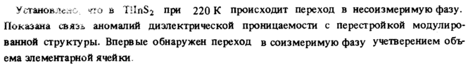Установлено, что в TllnSi при 220 К происходит переход в несоизмеримую фазу. Показана связь аномалий диэлектрической проницаемости с перестройкой модулированной структуры. Впервые обнаружен переход в соизмеримую фазу учетверением объ-ема элементарной ячейки