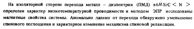 На изоляторной стороне перехода металл диэлектрик (ПМД) вбЯ-SiC < N > определен характер низкотемпературной проводимости и методом ЭПР исследованы магнитные свойства системы. Аномально далеко от перехода обнаружено уменьшение спинового поглощения и характерное изменение механизма спиновой релаксации.