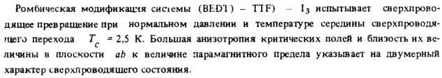 Ромбическая модификация си схемы (BEDT) TTF) I3 испытывает сверхпроводящее превращение при нормальном давлении и температуре середины сверхпроводящего перехода 7' = 2,5 К. Большая анизотропия критических полей и близость их величины в плоскости ab к величине парамагнитного предела указывает на двумерный характер сверхпроводящего состояния.