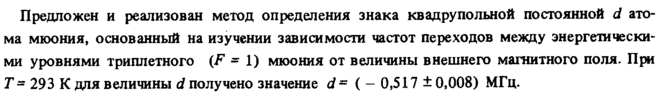 Предложен и реализован метод определения знака квадрупольной постоянной d атома мюония, основанный на изучении зависимости частот переходов между энергетическими уровнями триплетного [F = \) мюония от величины внешнего магнитного поля. При Г293 К для величины d получено значение d( 0,517 ± 0,008) МГц.