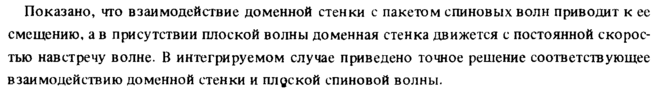 Показано, что взаимодействие доменной стенки с пакетом спиновых волн приводит к ее смещению, а в присутствии плоской волны доменная стенка движется с постоянной скоростью навстречу волне. В интегрируемом случае приведено точное решение соответствующее взаимодействию доменной стенки и плоской спиновой волны.