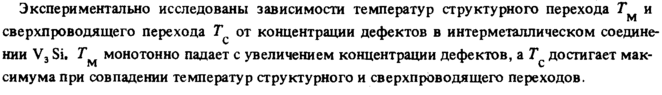Экспериментально исследованы зависимости температур структурного перехода 7*м и сверхпроводящего перехода Τ от концентрации дефектов в и нте ρ металл и чес ком соедине-нии V3 Si. Τ монотонно падает с увеличением концентрации дефектов, а Τ достигает мак-симумапри совпадении температур структурного и сверхпроводящего переходов.