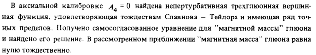 В аксиальной калибровке А4 ~ 0 найдена непертурбативная трехглюонная вершинная функция, удовлетворяющая тождествам Славнова Тейлора и имеющая ряд точных пределов. Получено самосогласованное уравнение для "магнитной массы" глюона и найдено его решение. В рассмотренном приближении "магнитная масса" глюона равна нулю тождественно.