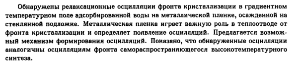 Обнаружены релаксационные осцилляции фронта кристаллизации в градиентном температурном поле адсорбированной воды на металлической пленке, осажденной на стеклянной подложке. Металлическая пленка играет важную роль в теплоотводе от фронта кристаллизации и определяет появление осцилляций. Предлагается возможный механизм формирования осцилляций. Показано, что обнаруженные осцилляции аналогичны осцилляциям фронта самораспространяющегося высокотемпературного синтеза.