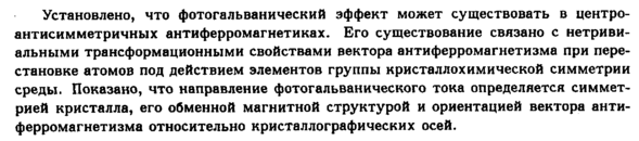 Установлено, что фотогальванический эффект может существовать в центро-антисимметричных антиферромагнетиках. Его существование связано с нетривиальными трансформационными свойствами вектора антиферромагнетизма при перестановке атомов под действием элементов группы кристаллохимической симметрии среды. Показано, что направление фотогальванического тока определяется симметрией кристалла, его обменной магнитной структурой и ориентацией вектора антиферромагнетизма относительно кристаллографических осей.