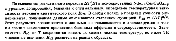 По смещению резистивного перехода АТ(В) в монокристаллах Nd2-«Cea;Cu04-v с уровнем допирования, близким к оптимальному, определена температурная зависимость верхнего критического поля Всч* В слабых полях, в пределах точности эксперимента, полученные данные описываются степенной функцией ВС2 ос (ΔΤ)3/2. Этот результат сравнивается с данными по теплоемкости и анализируется с точки зрения возможного проявления бозонных эффектов в сверхпроводимости. Зависимость ВС2 от Τ сохраняется вплоть до самых низких температур, но ниже 1К численные значения ВС2 разнятся на разных образцах.
