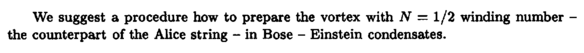 We suggest a procedure how to prepare the vortex with N — 1/2 winding number -the counterpart of the Alice string in Bose Einstein condensates.