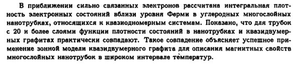 В приближении сильно связанных электронов рассчитана интегральная плотность электронных состояний вблизи уровня Ферми в углеродных многослойных нанотрубках, относящихся к квазиодномерным системам. Показано, что для трубок с 20 и более слоями функции плотности состояний в нанотрубках и квазидвумерных графитах практически совпадают. Такое совпадение объясняет успешное применение зонной модели квазидвумерного графита для описания магнитных свойств многослойных нанотрубок в широком интервале температур.