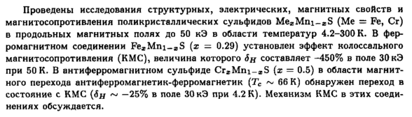 Проведены исследования структурных, электрических, магнитных свойств и магнитосопротивления поликристаллических сульфидов Mea-Mni-xS (Me = Fe, Cr) в продольных магнитных полях до 50 кЭ в области температур 4.2-300 К. В ферромагнитном соединении Fe^Mni-ajS (χ = 0.29) установлен эффект колоссального магнитосопротивления (KMC), величина которого <5д составляет -450% в поле 30 кЭ при 50 К. В антиферромагнитном сульфиде Crj-Mni-atS (χ = 0.5) в области магнитного перехода антиферромагнетик-ферромагнетик (Тс ~ 66 К) обнаружен переход в состояние с KMC (Й# ~ —25% в поле 30кЭ при 4.2 К). Механизм KMC в этих соединениях обсуждается.