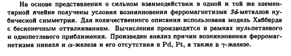 На основе представления о сильном взаимодействии в одной и той же элементарной ячейке получены условия возникновения ферромагнетизма 34-металлов кубической симметрии. Для количественного описания использована модель Хаббарда с бесконечным отталкиванием. Вычисления производятся в рамках нульпетлевого и однопетлевого приближения. Произведен анализ причин возникновения ферромагнетизма никеля и α-железа и его отсутствия в Pd, Pt, а также в 7-железе.