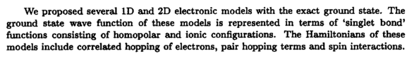 We proposed several ID and 2D electronic models with the exact ground state. The ground state wave function of these models is represented in terms of 'singlet bond* functions consisting of homopolar and ionic configurations. The Hamiltonians of these models include correlated hopping of electrons, pair hopping terms and spin interactions.