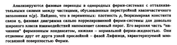 Анализируются фазовые переходы в однородных ферми-системах с отталкива-тельными силами между частицами, обусловленные перестройкой квазичастичного заполнения п(р). Найдено, что в переменных: плотность р, безразмерная константа связи п, фазовая диаграмма сильно коррелированной ферми-системы для довольно широкого класса взаимодействий напоминает слоеный пирог. Бго верхняя часть "начинена" фермионным конденсатом, нижняя нормальной ферми-жидкостью. Они отделены друг от друга узкой прослойкой фазой Лифшица, характеризуемой многосвязной поверхностью Ферми.