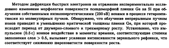 Методом дифракции быстрых электронов на отражение экспериментально исследовано изменение морфологии поверхности псевдоморфной пленки Ge на Si при облучении собственными низкоэнергетическими (230 эВ) ионами в процессе гетероэпи-таксии из молекулярных пучков. Обнаружено, что облучение непрерывным пучком ионов приводит к уменьшению критической толщины пленки Ge, при которой происходит переход от двумерно-слоевого к трехмерному росту. Установлено, что импульсное (0.5 с) ионное воздействие в моменты времени, соответствующие степени заполнения слоя > 0.5, вызывает усиление интенсивности зеркального рефлекса, что соответствует снижению шероховатости поверхности роста.