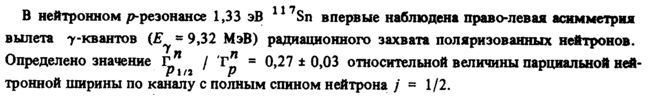 117 В нейтронном ^резонансе 1,33 эВ Sn впервые наблюдена право-левая асимметрия вылета γ-квантов = 9,32 МэВ) радиационного захвата поляризованных нейтронов. Определено значение ,Τρχη I г£ = 0,27 ± 0,03 относительной величины парциальной нейтронной ширины по каналу с полным спином нейтрона / 1/2.