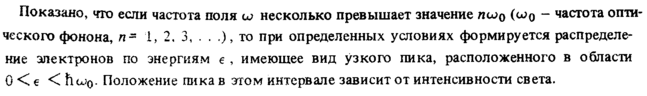 Показано, что если частота поля ω несколько превышает значение пи>о (ω0 частота оптического фонона, п= 1, 2. 3, . . .), то при определенных условиях формируется распределение электронов по энергиям е , имеющее вид узкого пика, расположенного в области О < € < (ϊω0. Положение пика в этом интервале зависит от интенсивности света.