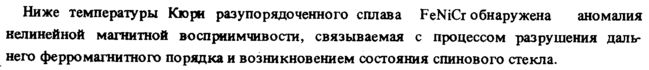 Ниже температуры Кюри разупорядоченного сплава FeNiCr обнаружена аномалия нелинейной магнитной восприимчивости, связываемая с процессом разрушения дальнего ферромагнитного порядка и возникновением состояния спинового стекла.