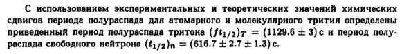 С использованием экспериментальных и теоретических значений химических сдвигов периода полураспада для атомарного и молекулярного трития определены приведенный период полураспада тритона (/ti/2)r = (1129.6 ± 3)с и период полураспада свободного нейтрона (*1/г)п = (616.7 ± 2.7 ± 1.3)с.