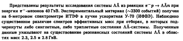 Представлены результаты исследования системы ЛЛ из реакции тг~р -+ ЛЛп при энергии ]г~-меэонов 40ГэВ. Экспериментальный материал (~2300 событий) получен на 6-метровом спектрометре ИТЭФ в пучке ускорителя У-70 (ИФВЭ). Наблюдено существенное различие спектров эффективных масс ,при отборах, в которых подчеркнуты либо синглетные, либо триплетные состояния Λλ-системы. Полученные данные указывают на существование резонансных состояний системы ΛΛ в областях масс 2.3, 2.5 и 2.8 ГэВ.