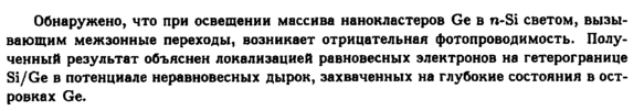 Обнаружено, что при освещении массива нанокластеров Ge в n-Si светом, вызывающим межзонные переходы, возникает отрицательная фотопроводимость. Полученный результат объяснен локализацией равновесных электронов на гетерогранице Si/Ge в потенциале неравновесных дырок, захваченных на глубокие состояния в островках Ge.
