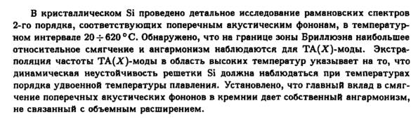 В кристаллическом Si проведено детальное исследование рамановских спектров 2-го порядка, соответствующих поперечным акустическим фононам, в температурном интервале 20-г620 °С. Обнаружено, что на границе зоны Бриллюэна наибольшее относительное смягчение и ангармонизм наблюдаются для ТА(Х)-моды. Экстраполяция частоты ТА(Х)-моды в область высоких температур указывает на то, что динамическая неустойчивость решетки Si должна наблюдаться при температурах порядка удвоенной температуры плавления. Установлено, что главный вклад в смягчение поперечных акустических фононов в кремнии дает собственный ангармонизм, не связанный с объемным расширением.