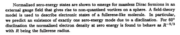 Normalized zero-energy states are shown to emerge for massless Dirac fermions in an external gauge field that gives rise to non-quantized vortices on a sphere. A field-theory model is used to describe electronic states of a fullerene-like molecule. In particular, we predict an existence of exactly one zero-energy mode due to a disclination. For 60° disclination the normalized electron density at zero energy is found to behave as Д-5/3 with R being the fullerene radius.