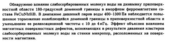 Обнаружено влияние слабосорбированных молекул воды на динамику приповерхностной области 180-градусной доменной границы в аморфном ферромагнетике состава FeCuNbSiB. В диапазоне давлений паров воды 400-1300 Па наблюдается повышенное торможение колеблющейся доменной границы в приповерхностной области и уменьшение ее релаксационной частоты с 10 до 4 кГц. Эффект объяснен влиянием магнитных поверхностных дефектов, возникающих в результате давления кластеров слабосорбированных молекул воды на стенки микропор, расположенных на поверхности магнетика.