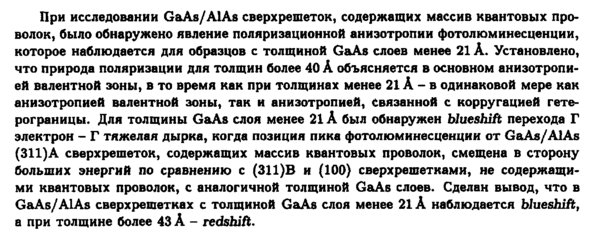 При исследовании GaAs/AlAs сверхрешеток, содержащих массив квантовых проволок, было обнаружено явление поляризационной анизотропии фотолюминесценции, которое наблюдается для образцов с толщиной GaAs слоев менее 21 А. Установлено, что природа поляризации для толщин более 40 А объясняется в основном анизотропией валентной зоны, в то время как при толщинах менее 21А в одинаковой мере как анизотропией валентной зоны, так и анизотропией, связанной с корругацией гете-рограницы. Для толщины GaAs слоя менее 21А был обнаружен blueshift перехода Г электрон Г тяжелая дырка, когда позиция пика фотолюминесценции от GaAs/AlAs (311)А сверхрешеток, содержащих массив квантовых проволок, смещена в сторону больших энергий по сравнению с (311)В и (100) сверхрешетками, не содержащими квантовых проволок, с аналогичной толщиной GaAs слоев. Сделан вывод, что в GaAs/AlAs сверхрешетках с толщиной GaAs слоя менее 21А наблюдается blueshift, а при толщине более 43 А redshift.