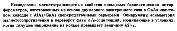 Исследованы магнетотранспортные свойства кольцевых баллистических интерферометров, изготовленных на основе двумерного электронного газа в GaAs квантовом колодце с AlAs/GaAs сверхрешеточными барьерами. Обнаружены асимметрия магнетосопротивления и переворот фазы Λ/е-осцилляций, возникающие в условиях, когда тянущее напряжение на кольце превышает величину кТ/е.