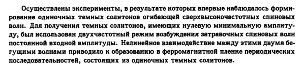Осуществлены эксперименты, в результате которых впервые наблюдалось формирование одиночных темных солитонов огибающей сверхвысокочастотных спиновых волн. Для получения темных солитонов, имеющих нулевую минимальную амплитуду, был использован двухчастотный режим возбуждения затравочных спиновых волн постоянной входной амплитуды. Нелинейное взаимодействие между этими двумя бегущими волнами приводило к образованию в ферромагнитной пленке периодических последовательностей, состоящих из одиночных темных солитонов.