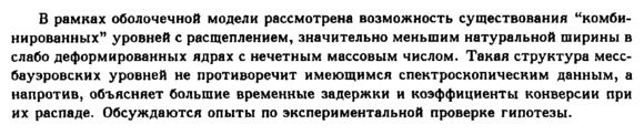 В рамках оболочечной модели рассмотрена возможность существования "комбинированных" уровней с расщеплением, значительно меньшим натуральной ширины в слабо деформированных ядрах с нечетным массовым числом. Такая структура месс-бауэровских уровней не противоречит имеющимся спектроскопическим данным, а напротив, объясняет большие временные задержки и коэффициенты конверсии при их распаде. Обсуждаются опыты по экспериментальной проверке гипотезы.