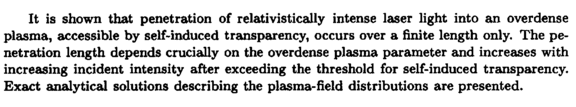 It is shown that penetration of relativistically intense laser light into an overdense plasma, accessible by self-induced transparency, occurs over a finite length only. The penetration length depends crucially on the overdense plasma parameter and increases with increasing incident intensity after exceeding the threshold for self-induced transparency. Exact analytical solutions describing the plasma-field distributions are presented.