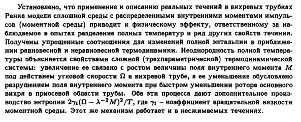 Установлено, что применение к описанию реальных течений в вихревых трубках Ранка модели сплошной среды с распределенными внутренними моментами импульсов (моментной среды) приводит к физическому эффекту, ответственному за наблюдаемое в опытах разделение полных температур и ряд других свойств течения. Получены упрощенные соотношения для изменений полной энтальпии в приближении равновесной и неравновесной термодинамики. Неоднородность полной температуры объясняется свойствами сложной (трехпараметрической) термодинамической системы: увеличение ее связано с ростом величины поля внутреннего момента Μ под действием угловой скорости Ω в вихревой трубе, а ее уменьшение обусловлено разрушением поля внутреннего момента при быстром уменьшении ротора основного вихря в приосевой области трубы. Оба эти процесса дают дополнительное производство энтропии 27t(fi — λ_2Μ)2/Τ, где ц коэффициент вращательной вязкости моментной среды. Этот же механизм работает и в несжимаемых течениях.