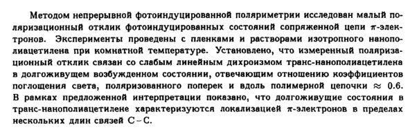 Методом непрерывной фотоиндуцированной поляриметрии исследован малый поляризационный отклик фотоиндуцированных состояний сопряженной цепи 7Г-элек-тронов. Эксперименты проведены с пленками и растворами изотропного нанопо-лиацетилена при комнатной температуре. Установлено, что измеренный поляризационный отклик связан со слабым линейным дихроизмом транс-нанополиацетилена в долгоживущем возбужденном состоянии, отвечающим отношению коэффициентов поглощения света, поляризованного поперек и вдоль полимерной цепочки Ri 0.6. В рамках предложенной интерпретации показано, что долгоживущие состояния в транс-нанополиацетилене характеризуются локализацией π-электронов в пределах нескольких длин связей С-С.