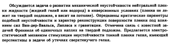 Обсуждается задача о развитии механической неустойчивости нейтральной пленки жидкости (жидкий гелий или водород) в инверсионных условиях (пленка не лежит на твердой подложке, а висит на потолке). Определены критические параметры подобной неустойчивости и характер реконструкции поверхности пленки под влиянием сил Ван-дер-Ваальса, Лапласа и гравитации. Отмечена связь с известной задачей Френкеля об одиночных каплях на твердой подложке. Предлагается электростатический механизм стимуляции неустойчивости тонкой пленки гелия, имеющий перспективы в задаче об утечках сверхтекучего гелия.