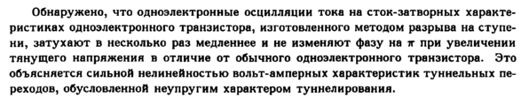 Обнаружено, что одноэлектронные осцилляции тока на сток-затворных характеристиках одноэлектронного транзистора, изготовленного методом разрыва на ступени, затухают в несколько раз медленнее и не изменяют фазу на π при увеличении тянущего напряжения в отличие от обычного одноэлектронного транзистора. Это объясняется сильной нелинейностью вольт-амперных характеристик туннельных переходов, обусловленной неупругим характером туннелирования.