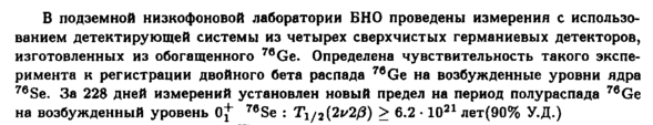 В подземной низкофоновой лаборатории БНО проведены измерения с использованием детектирующей системы из четырех сверхчистых германиевых детекторов, изготовленных из обогащенного 7eGe. Определена чувствительность такого эксперимента к регистрации двойного бета распада 7eGe на возбужденные уровни ядра 76 Se. За 228 дней измерений установлен новый предел на период полураспада 76 Ge на возбужденный уровень 0^" 7eSe : Τ1/2(2ι/2/3) > 6.2 -1021 лет(90% У.Д.)