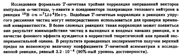Исследована формально Т-нечетная тройная корреляция направлений векторов импульсов α-частицы, 7-кванта и псевдовектора поляризации .теплового нейтрона в реакции 10В +n =7Li+4He+7. Подобные Т-нечетные корреляции в реакциях упругого рассеяния частиц могут непосредственно использоваться для проверки временной инвариантности. В более сложных реакциях такая корреляция может появиться как результат взаимодействия частиц в выходных и входных каналах реакции, и в качестве фонового эффекта нуждается в корректной теоретической или прямой экспериментальной оценке. В результате проведенных экспериментов получен верхний предел на возможную величину коэффициента Т-нечетной асимметрии в исследованной реакции, равный 3.2 · 10~4 (90%-ный уровень достоверности).