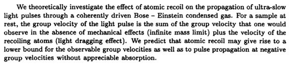 We theoretically investigate the effect of atomic recoil on the propagation of ultra^slow light pulses through a coherently driven Bose Einstein condensed gas. For a sample at rest, the group velocity of the light pulse is the sum of the group velocity that one would observe in the absence of mechanical effects (infinite mass limit) plus the velocity of the recoiling atoms (light dragging effect). We predict that atomic recoil may give rise to a lower bound for the observable group velocities as well as to pulse propagation at negative group velocities without appreciable absorption.