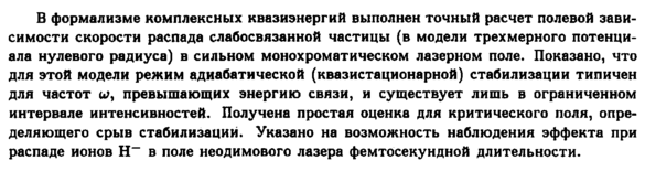 В формализме комплексных квазиэнергий выполнен точный расчет полевой зависимости скорости распада слабосвязанной частицы (в модели трехмерного потенциала нулевого радиуса) в сильном монохроматическом лазерном поле. Показано, что для этой модели режим адиабатической (квазистационарной) стабилизации типичен для частот w, превышающих энергию связи, и существует лишь в ограниченном интервале интенсивностей. Получена простая оценка для критического поля, определяющего срыв стабилизации. Указано на возможность наблюдения эффекта при распаде ионов Н~ в поле неодимового лазера фемтосекундной длительности.